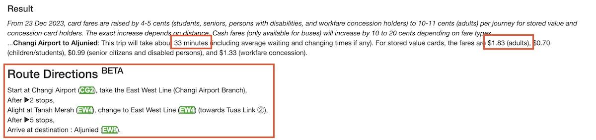 Как видно из скриншота выше – поездка из Аэропорта Чанги к нашему отелю (7 остановок) на метро занимает примерно 33 минуты. Стоимость – 1.83 SGD. Также показывается подсказка – на какой станции сесть, где сделать пересадку и какая станция конечная.