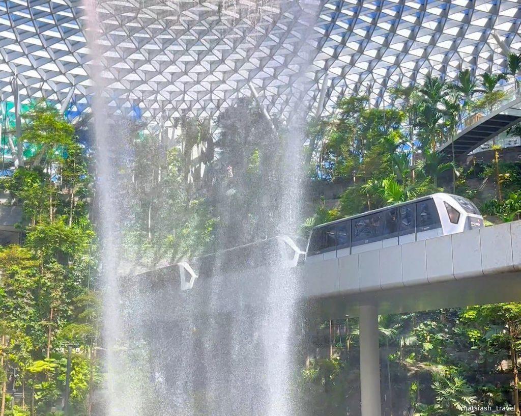 За водопадом виден поезд, курсирующий между терминалами в аэропорту Сингапура